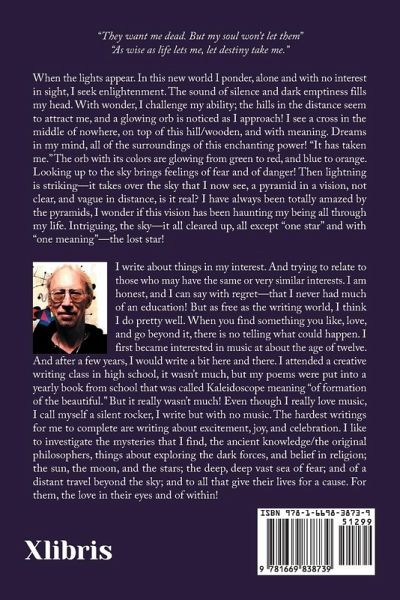 When the lights appear. In this new world I ponder, alone and with no interest in sight, I seek enlightenment. The sound of silence and dark emptiness fills my head. With wonder, I challenge my ability; the hills in the distance seem to attract me, and a glowing orb is noticed as I approach! I see a cross in the middle of nowhere, on top of this hill/wooden, and with meaning. Dreams in my mind, all of the surroundings of this enchanting power! "It has taken me." The orb with its colors are glowing from green to red, and blue to orange. Looking up to the sky brings feelings of fear and of danger! Then lightning is striking-it takes over the sky that I now see, a pyramid in a vision, not clear, and vague in distance, is it real? I have always been totally amazed by the pyramids, I wonder if this vision has been haunting my being all through my life. Intriguing, the sky-it all cleared up, all except "one star" and with "one meaning"-the lost star!