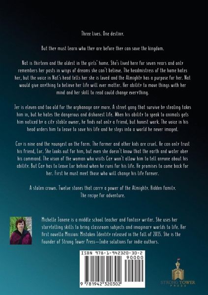 Nat is thirteen and the oldest in the girls' home. She's lived here for seven years and only remembers her pasts in wisps of dreams she can't believe. The headmistress of the home hates her, but the voice in Nat's head tells her she is loved and the Almighty has a purpose for her. Nat would give anything to believe her life will ever matter. Her ability to move things with her mind and her skill to read could change everything. Jer is eleven and too old for the orphanage any more. A street gang that survives by stealing takes him in, but he hates the danger and dishonest life. When his ability to speak to animals gets him noticed by a city stable owner, he finds not only a friend but honest work. The voice in his head orders him to leave to save his life and he steps into a world he never imaged. Cay is nine and the youngest on the farm. The farmer and other kids are cruel. He can only trust his friend, Lor. She looks out for him, but even she doesn't know that the earth and water obey his command. The vision of the woman who visits Cay won't allow him to tell anyone about his ability. But Cay has to leave Lor behind when runs for his life. He promises to come back for her. First, he must meet those who will change his life forever. A stolen crown. Twelve stones that carry a power of the Almighty. Hidden family. The recipe for adventure.