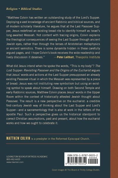 In The Lost Supper, Matthew Colvin argues that Jesus did not create new symbolism with his words and actions at the Last Supper but, rather, invoked an already-existing Passover ritual. He therefore corrects assumptions, past and present, about how the Eucharist works and how we ought to celebrate it.