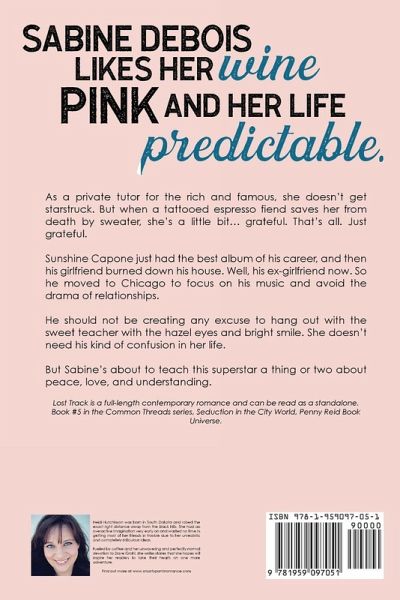 Sabine Debois likes her wine pink and her life predictable. As a private tutor for the rich and famous, she doesn't get starstruck. But when a tattooed espresso fiend saves her from death by sweater, she's a little bit... grateful. That's all. Just grateful. Sunshine Capone just had the best album of his career, and then his girlfriend burned down his house. Well, his ex-girlfriend now. So he moved to Chicago to focus on his music and avoid the drama of relationships. He should not be creating any excuse to hang out with the sweet teacher with the hazel eyes and bright smile. She doesn't need his kind of confusion in her life. But Sabine's about to teach this superstar a thing or two about peace, love, and understanding. Lost Track is a full-length contemporary romance and can be read as a standalone. Book #5 in the Common Threads series, Seduction in the City World, Penny Reid Book Universe.