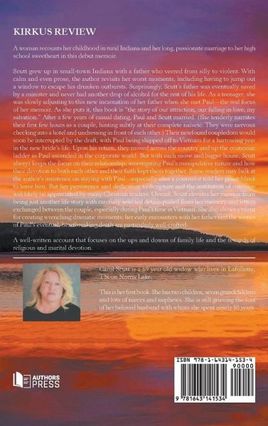 A woman recounts her childhood in rural Indiana and her long, passionate marriage to her high school sweetheart in this debut memoir. Scutt grew up in small-town Indiana with a father who veered from silly to violent. With calm and even prose, the author revisits her worst moments, including having to jump out a window to escape his drunken outbursts. Surprisingly, Scutt's father was eventually saved by a minister and never had another drop of alcohol for the rest of his life. As a teenager, she was slowly adjusting to this new incarnation of her father when she met Paul-the real focus of her memoir. As she puts it, this book is "the story of our attraction, our falling in love, my salvation." After a few years of casual dating, Paul and Scutt married. (She tenderly narrates their first few hours as a couple, hinting subtly at their complete naïveté: They were nervous checking into a hotel and undressing in front of each other.) Their newfound coupledom would soon be interrupted by the draft, with Paul being shipped off to Vietnam for a harrowing year in the new bride's life. Upon his return, they moved across the country and up the economic ladder as Paul ascended in the corporate world. But with each move and bigger house, Scutt always keeps the focus on their relationship, investigating Paul's manipulative nature and how their devotion to both each other and their faith kept them together. Some readers may balk at the author's insistence on staying with Paul-especially after a counselor told her point-blank to leave him. But her persistence and dedication to Scripture and the institution of marriage will likely be appreciated by many Christian readers. Overall, Scutt elevates her memoir from being just another life story with carefully selected details pulled from her memory and letters exchanged between the couple, especially during Paul's time in Vietnam. She also shows a talent for creating wrenching dramatic moments; her early encounters with her father and the scenes of Paul's eventual, heartbreaking death are particularly well-crafted. A well-written account that focuses on the ups and downs of family life and the rewards of religious and marital devotion.