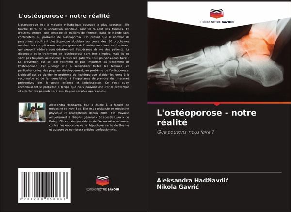 L'ostéoporose est la maladie métabolique osseuse la plus courante. Elle touche 10 % de la population mondiale, dont 90 % sont des femmes. En d'autres termes, une centaine de millions de femmes dans le monde sont confrontées au problème de l'ostéoporose. On prévoit que le nombre de personnes souffrant d'ostéoporose doublera au cours des 50 prochaines années. Les complications les plus graves de l'ostéoporose sont les fractures, qui peuvent réduire considérablement l'espérance de vie des patients. Le diagnostic et le traitement de l'ostéoporose sont très simples, mais ils ne sont pas toujours accessibles à tous les patients. Que pouvons-nous faire ? La prévention est de loin l'élément le plus important du traitement de l'ostéoporose. Cet ouvrage vise à sensibiliser toutes les femmes, en particulier celles des pays en développement, au problème de l'ostéoporose. L'objectif est de clarifier le problème de l'ostéoporose, d'aider les gens à le reconnaître et de les sensibiliser à l'importance de prendre des mesures préventives dès la petite enfance et l'adolescence. Ce n'est qu'en reconnaissant le problème à temps que nous pouvons assurer la prévention et orienter les patients vers des diagnostics plus approfondis.