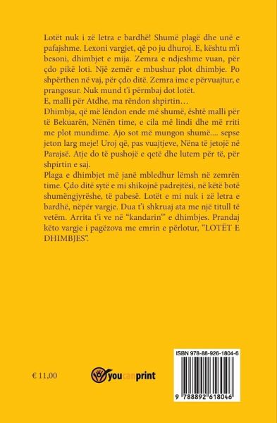 Non basta la carta bianca per descrivere tutte le lacrime. Le ferite sono tante ma io non ho colpe. Leggete i versi che vi regalo. Solo così crederete al mio dolore. Il cuore sensibile soffre, per ogni lacrima versata. Un cuore pieno di dolore. Piange ogni giorno, imprigionato. Non posso mantenere le lacrime. La nostalgia per la mia patria mi appesantisce l'anima. Ciò che mi provoca più dolore è la nostalgia per mia madre, che mi ha partorito e cresciuto con molta fatica. Mi manca tantissimo. Mi auguro che dopo tutta la sua sofferenza, mia madre riposi in pace. Laggiù riposerà tranquilla ed io prego per lei e per il suo spirito. Le ferite si sono aggrovigliate nel mio cuore. Ogni giorno i miei occhi vedono ingiustizie in questo mondo multicolore. Per le mie lacrime non bastano i versi sulle pagine bianche. Le voglio descrivere solo con un titolo. Ho finito per metterle sulla bilancia del dolore. Battezzo questi versi con il titolo "Lotët e dhimbjes" (le lacrime del dolore).