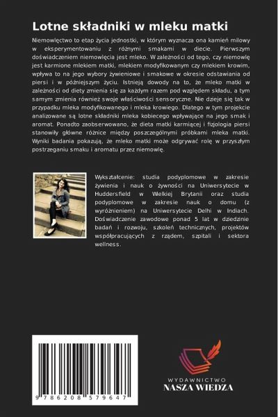 Niemowl¿ctwo to etap ¿ycia jednostki, w którym wyznacza ona kamie¿ milowy w eksperymentowaniu z ró¿nymi smakami w diecie. Pierwszym do¿wiadczeniem niemowl¿cia jest mleko. W zale¿no¿ci od tego, czy niemowl¿ jest karmione mlekiem matki, mlekiem modyfikowanym czy mlekiem krowim, wp¿ywa to na jego wybory ¿ywieniowe i smakowe w okresie odstawiania od piersi i w pó¿niejszym ¿yciu. Istniej¿ dowody na to, ¿e mleko matki w zale¿no¿ci od diety zmienia si¿ za kädym razem pod wzgl¿dem sk¿adu, a tym samym zmienia równie¿ swoje w¿äciwo¿ci sensoryczne. Nie dzieje si¿ tak w przypadku mleka modyfikowanego i mleka krowiego. Dlatego w tym projekcie analizowane s¿ lotne sk¿adniki mleka kobiecego wp¿ywaj¿ce na jego smak i aromat. Ponadto zaobserwowano, ¿e dieta matki karmi¿cej i fizjologia piersi stanowi¿y g¿ówne ró¿nice mi¿dzy poszczególnymi próbkami mleka matki. Wyniki badania pokazuj¿, ¿e mleko matki mo¿e odgrywä rol¿ w przysz¿ym postrzeganiu smaku i aromatu przez niemowl¿.