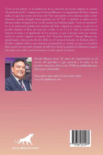 "Loto en mi palma" es la traducción de la colección de poesía original en asamés "Karatala Kamala" compuesta por Devajit Bhuyan. La singularidad del libro original radica en que fue escrito sin el uso del "kar" prevalente en los idiomas indios como sánscrito, asamés, bengalí, hindi, gujarati, etc. El "kar" o símbolo se utiliza en los idiomas indios en lugar de las vocales usadas en el idioma inglés. "Loto en mi palma" no es la traducción palabra por palabra del libro original en asamés, ya que no es posible traducir el libro sin usar las vocales A, E, I, O, U. Solo se mantuvieron intactos el tema y el significado de los poemas, ya que el propio autor los tradujo desde la versión original en asamés. Por "Karatala Kamala", Devajit Bhuyan fue galardonado como poeta del año 2022 en el Carnaval Literario de Kolkata (KLC). El libro original obtuvo una inmensa popularidad en Assam, ya que es el primer libro escrito en este estilo después de 600 años desde la partida de Sankardeva, quien introdujo este estilo y posteriormente el estilo quedó en desuso.