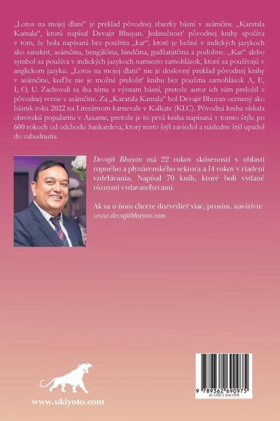 ¿Lotos na mojej dlani" je preklad pôvodnej zbierky básní v asám¿ine ¿Karatala Kamala", ktorú napísal Devajit Bhuyan. Jedine¿nos¿ pôvodnej knihy spöíva v tom, ¿e bola napísaná bez poüitia ¿kar", ktoré je be¿né v indických jazykoch ako sanskrit, asám¿ina, bengál¿ina, hind¿ina, gud¿arát¿ina a podobne. ¿Kar" alebo symbol sa poüíva v indických jazykoch namiesto samohlások, ktoré sa poüívajú v anglickom jazyku. ¿Lotos na mojej dlani" nie je doslovný preklad pôvodnej knihy v asám¿ine, ke¿¿e nie je möné prelöi¿ knihu bez poüitia samohlások A, E, I, O, U. Zachovali sa iba téma a význam básní, pretöe autor ich sám prelöil z pôvodnej verzie v asám¿ine. Za ¿Karatala Kamala" bol Devajit Bhuyan ocenený ako básnik roka 2022 na Literárnom karnevale v Kalkate (KLC). Pôvodná kniha získala obrovskú popularitu v Assame, pretöe je to prvá kniha napísaná v tomto ¿týle po 600 rokoch od odchodu Sankardeva, ktorý tento ¿týl zaviedol a následne ¿týl upadol do zabudnutia.