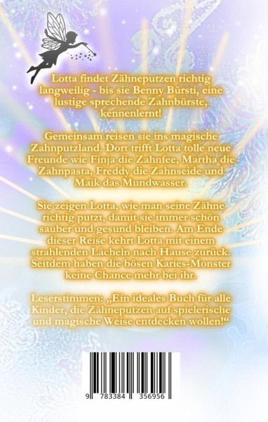Lotta findet Zähneputzen richtig langweilig - bis sie Benny Bürsti, eine lustige sprechende Zahnbürste, kennenlernt! Gemeinsam reisen sie ins magische Zahnputzland. Dort trifft Lotta tolle neue Freunde wie Finja die Zahnfee, Martha die Zahnpasta, Freddy die Zahnseide und Maik das Mundwasser. Sie zeigen Lotta, wie man Zähne richtig putzt, damit sie immer schön sauber und gesund bleiben. Am Ende kehrt Lotta mit einem strahlenden Lächeln nach Hause zurück. Seitdem haben die bösen Karies-Monster keine Chance mehr bei ihr!Leserstimmen: Ein ideales Buch für Kinder, die Zähneputzen auf spielerische und magische Weise entdecken wollen!