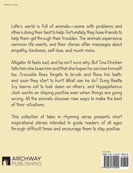 Lotte's world is full of animals-some with problems and others doing their best to help. Fortunately, they have friends to help them get through their troubles. The animals experience common life events, and their stories offer messages about empathy, kindness, self-love, and much more. Alligator Al feels sad, and he isn't sure why. But Tina Chicken tells him she loves him and that she hopes he can love himself too. Crocodile Ross forgets to brush and floss his teeth, and soon they start to hurt! What can he do? Dung Beetle Ivy learns not to look down on others, and Hippopotamus Josh works on staying positive even when things are going wrong. All the animals discover new ways to make the best of their situations. This collection of tales in rhyming verse presents short inspirational stories intended to guide readers of all ages through difficult times and encourage them to stay positive.