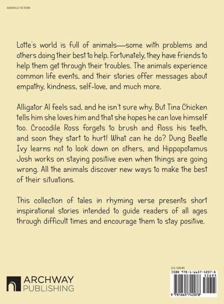 Lotte's world is full of animals-some with problems and others doing their best to help. Fortunately, they have friends to help them get through their troubles. The animals experience common life events, and their stories offer messages about empathy, kindness, self-love, and much more. Alligator Al feels sad, and he isn't sure why. But Tina Chicken tells him she loves him and that she hopes he can love himself too. Crocodile Ross forgets to brush and floss his teeth, and soon they start to hurt! What can he do? Dung Beetle Ivy learns not to look down on others, and Hippopotamus Josh works on staying positive even when things are going wrong. All the animals discover new ways to make the best of their situations. This collection of tales in rhyming verse presents short inspirational stories intended to guide readers of all ages through difficult times and encourage them to stay positive.