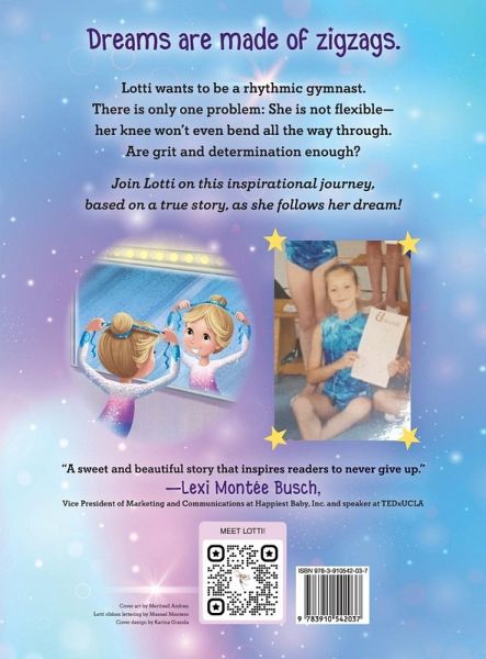Based on a true story! A powerful tale about never giving up. "A sweet and beautiful story that inspires readers to never give up." - Lexi Montee Busch, Vice President of Marketing and Communications at Happiest Baby, Inc. and speaker at TEDxUCLA Dreams are made of zigzags! Lotti wants to be a rhythmic gymnast. There is only one problem: She is not flexible- her knee won't even bend all the way through. Are grit and determination enough? Join Lotti on this inspirational journey, based on a true story, as she follows her dream! Lotti's story is also available as a page-turning middle grade book for ages 8 and up: Lotti and the Impossible Dream. ¿