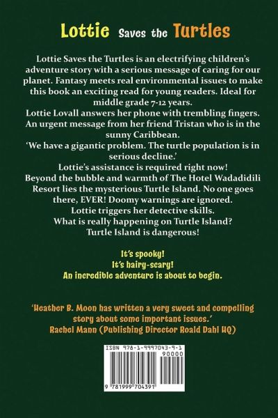 Lottie Saves the Turtles is an action packed illustrated children’s chapter book. Heather B. Moon weaves fantasy together with an important environmental message to make this story come alive for young readers. Ideal for children ages 7-12 years. ‘Heather B. Moon has written a very sweet and compelling story about some important issues.’ Rachel Mann (Publishing Director Roald Dahl HQ). Lottie Lovall answers her phone with trembling fingers. It’s an urgent message from her friend Tristan from the sunny Caribbean island of Wadadidili. ‘We have a gigantic problem. The turtle population is in serious decline.’ Lottie’s assistance is required right now! An incredible adventure is about to begin. Beyond the bubble and warmth of The Hotel Wadadidili Resort lies the mysterious Turtle Island. No one goes there, EVER! Doomy warnings from Granny Marley are ignored. Lottie has no choice! When her young brother, Jack and his friend Charley are whooshed out to sea on a plastic sea-tractor Lottie snatches a jet-ski and whisks across the bay to the mysterious Turtle Island. But what is really happening on Turtle Island? Turtle Island is dangerous! It’s spooky! It’s hairy-scary! Lottie needs to keep her cool. She has to find the boys. Then she meets Papa Zakarus, a weird beast-man. He tells her the whole truth about the island’s inhabitants and hands her The Sacred Pendant for guidance. During her mission Lottie triggers her detective skills. She discovers a horrid link between the declining turtle population and evil voodoo magic. Lottie Saves the Turtles is an electrifying adventure story with a serious message of caring for our planet. Fantasy meets real environmental issues to make this book an exciting read for young readers.