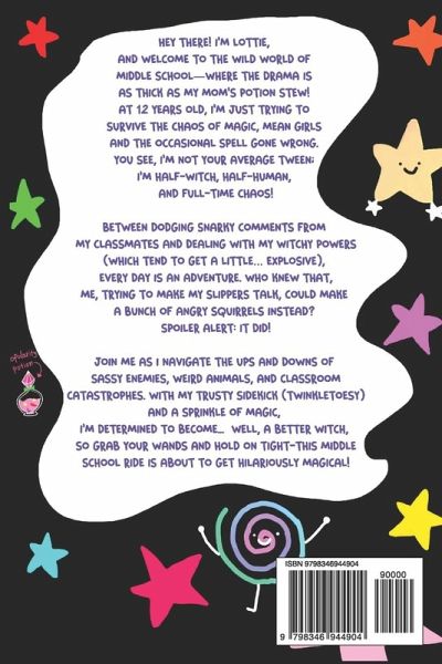 Hey there! I'm Lottie, and welcome to the wild world of middle school-where the drama is as thick as my mom's potion stew! At 12 years old, I'm just trying to survive the chaos of magic, mean girls and the occasional spell gone wrong. You see, I'm not your average tween; I'm half-witch, half-human, and full-time chaos! Between dodging snarky comments from my classmates and dealing with my witchy powers (which tend to get a little... explosive), every day is an adventure. Who knew that, me, trying to make my slippers talk, could make a bunch of angry squirrels instead? Spoiler alert: it did! Join me as I navigate the ups and downs of sassy enemies, weird animals, and classroom catastrophes. With my trusty sidekick (TwinkleToesy) and a sprinkle of magic, I'm determined to become... well, a better witch, so grab your wands and hold on tight-this middle school ride is about to get hilariously magical!