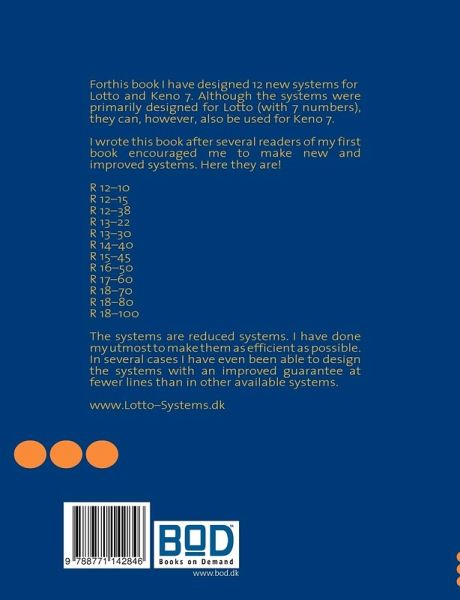 For this book I have designed 12 new systems for Lotto and Keno 7. Although the systems were primarily designed for Lotto (with 7 numbers), they can, however, also be used for Keno 7.I wrote this book after several readers of my first book encouraged me to make new and improved systems. Here they are!R 12-10R 12-15R 12-38R 13-22R 13-30R 14-40R 15-45R 16-50R 17-60R 18-70R 18-80R 18-100The systems are reduced systems. I have done my utmost to make them as efficient as possible. In several cases I have even been able to design the systems with an improved guarantee at fewer lines than in other available systems.www.Lotto-Systems.dk