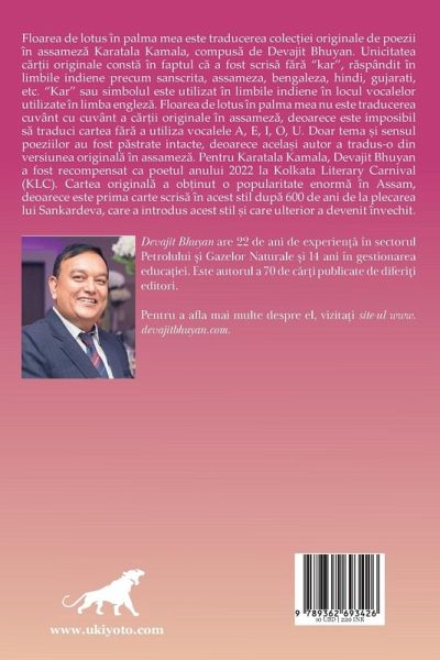 Floarea de lotus în palma mea este traducerea colec¿iei originale de poezii în assamez¿ Karatala Kamala, compus¿ de Devajit Bhuyan. Unicitatea c¿r¿ii originale const¿ în faptul c¿ a fost scris¿ f¿r¿ "kar", r¿spândit în limbile indiene precum sanscrita, assameza, bengaleza, hindi, gujarati, etc. "Kar" sau simbolul este utilizat în limbile indiene în locul vocalelor utilizate în limba englez¿. Floarea de lotus în palma mea nu este traducerea cuvânt cu cuvânt a c¿r¿ii originale în assamez¿, deoarece este imposibil s¿ traduci cartea f¿r¿ a utiliza vocalele A, E, I, O, U. Doar tema ¿i sensul poeziilor au fost p¿strate intacte, deoarece aceläi autor a tradus-o din versiunea original¿ în assamez¿. Pentru Karatala Kamala, Devajit Bhuyan a fost recompensat ca poetul anului 2022 la Kolkata Literary Carnival (KLC). Cartea original¿ a ob¿inut o popularitate enorm¿ în Assam, deoarece este prima carte scris¿ în acest stil dup¿ 600 de ani de la plecarea lui Sankardeva, care a introdus acest stil ¿i care ulterior a devenit învechit.