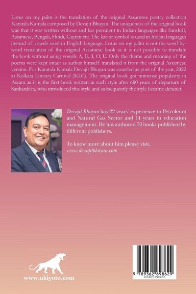 Lotus on my palm is the translation of the original Assamese poetry collection Karatala Kamala composed by Devajit Bhuyan. The uniqueness of the original book was that it was written without and kar prevalent in Indian languages like Sanskrit, Assamese, Bengali, Hindi, Gujrati etc. The kar or symbol is used in Indian languages instead of vowels used in English language. Lotus on my palm is not the word-byword translation of the original Assamese book as it is not possible to translate the book without using vowels A, E, I, O, U. Only the theme and meaning of the poems were kept intact as author himself translated it from the original Assamese version. For Karatala Kamala Devajit Bhuyan was awarded as poet of the year, 2022 at Kolkata Literary Carnival (KLC). The original book got immense popularity in Assam as it is the first book written in such style after 600 years of departure of Sankardeva, who introduced this style and subsequently the style became defunct.