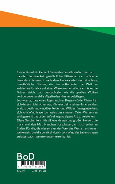 Es war einmal ein kleiner Löwenzahn, den alle einfach nur Lou nannten. Lou war kein gewöhnliches Pflänzchen - er hatte eine besondere Sehnsucht nach dem Unbekannten und eine leise, unaufhörliche Stimme, die ihn aufforderte, die Welt zu entdecken. Er lebte auf einer Wiese, wo der Wind sanft über die Gräser strich, und beobachtete, wie die großen Wolken vorüberzogen und die Vögel in den Himmel aufstiegen. Lou wusste, dass eines Tages auch er fliegen würde. Obwohl er sich dessen nicht sicher war, fühlte er tief in seinem Inneren, dass er dazu bestimmt war, über Felder und Wälder hinwegzutreiben, sich vom Wind tragen zu lassen, um an neuen Orten Wurzeln zu schlagen und das Leben auf seine ganz eigene Art zu verstehen. Diese Geschichte ist für all jene kleinen und großen Herzen, die manchmal den Mut brauchen, loszulassen, um sich selbst zu finden. Für die, die wissen, dass der Weg des Wachstums immer weitergeht, und die bereit sind, sich vom Wind des Lebens tragen zu lassen, auch wenn er unvorhersehbar ist.