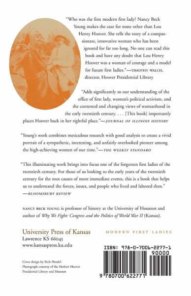 Although overshadowed by her higher-profile successors, Lou Henry Hoover was in many ways the nation’s first truly modern First Lady. She was the first to speak on the radio and give regular interviews. She was the first to be a public political persona in her own right. And, although the White House press corps saw in her “old-fashioned wifehood,” she very much foreshadowed the ""new woman"" of the era. Nancy Beck Young presents the first thoroughly documented study of Lou Henry Hoover’s White House years, 1929–1933, showing that, far from a passive prelude to Eleanor Roosevelt, she was a true innovator. Young draws on the extensive collection of Lou Hoover’s personal papers to show that she was not only an important First Lady but also a key transitional figure between nineteenth- and twentieth-century views on womanhood. Lou Hoover was a multifaceted woman: a college graduate, a lover of the outdoors, a supporter of Girl Scouting, and a person engaged in social activism who endorsed political involvement for women and created a program to fight the Depression. Young traces Hoover’s many philanthropic efforts both before and during the Hoover presidency—contrasting them with those of her husband—and places her public activities in the larger context of contemporary women's activism. And she shows that, unlike her predecessors, Hoover did more than entertain: she revolutionized the office of First Lady. Yet as Young reveals, Hoover was constrained as First Lady by her inability to achieve the same results that she had previously accomplished in her very public career for the volunteer community. As diligently as she worked to combat the hardship of the Depression for average Americans by mobilizing private relief efforts, her efforts ultimately had little effect. Although her celebrity has paled in the shadow of her husband’s negative association with the Great Depression, Lou Hoover’s story reveals a dynamic woman who used her activism to refashion the office of First Lady into a modern institution reflecting changes in the ways American women lived their lives. Young’s study of Hoover’s White House years shows that her legacy of innovation made a lasting mark on the office and those who followed.