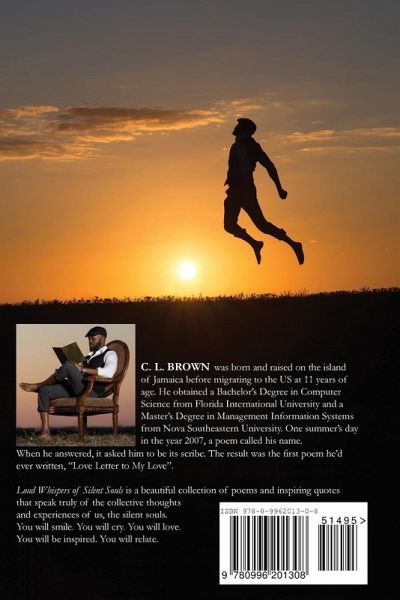 C. L. Brown is hauntingly honest and intimate in this revealing collection of poems. This collection far transcends mere words written to be read. It will speak to you. It will speak about you. It will tell you things and have you feeling ways that seem completely unique to you until you realize that you are actually one of us, the silent souls. His soul is laid bare as he traverses the pathways of Love, Inspiration, Spirituality, Passion, Heartbreak and the deeply moving Love shared with his beloved Mother. Between the poems you will find a collection of hidden treasures, quotes that will inspire and uplift your soul. You will smile. You will cry. You will love. You will be inspired. You will relate.