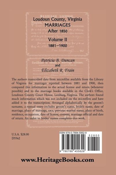 The authors transcribed data from microfilm available from the Library of Virginia for marriages reported between 1881 and 1900, then compared this information to the actual license and return (whenever possible) and to the marriage books available in the Clerk's Office, Loudoun County Court House, Leesburg, Virginia. The authors found much information which was not included on the microfilm and have added it to the transcription. Arranged alphabetically by the groom's surname, a typical entry includes groom's name, bride's name, date of marriage, place of marriage, race, previous marital status, place of birth, residence, occupation, date of license, consent, marriage official and date of return. An index to brides' names completes this work.