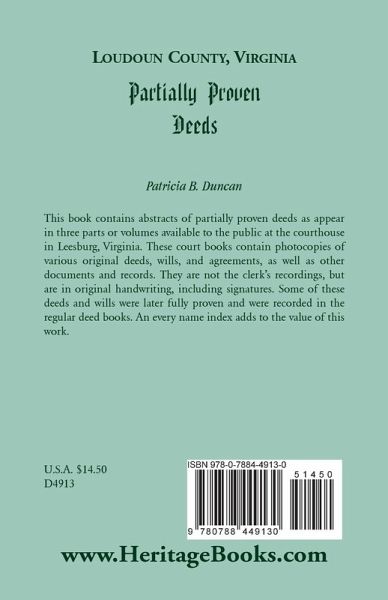 This book contains abstracts of partially proven deeds as appear in three parts or volumes available to the public at the courthouse in Leesburg, Virginia. These court books contain photocopies of various original deeds, wills, and agreements, as well as other documents and records. They are not the clerk's recordings, but are in original handwriting, including signatures. Some of these deeds and wills were later fully proven and were recorded in the regular deed books. An every name index adds to the value of this work.