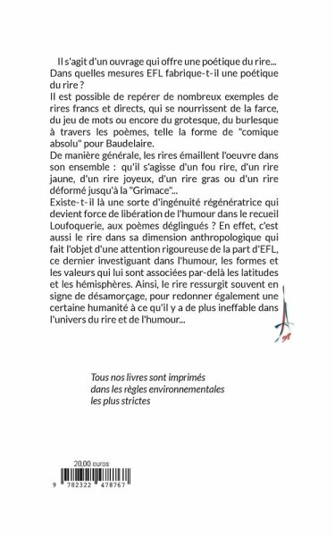 Il s'agit d'un ouvrage qui offre une poétique du rire... Dans quelles mesures EFL fabrique-t-il une poétique du rire ? Il est possible de repérer de nombreux exemples de rires francs et directs, qui se nourrissent de la farce, du jeu de mots ou encore du grotesque, du burlesque à travers les poèmes, telle la forme de "comique absolu" pour Baudelaire. De manière générale, les rires émaillent l'oeuvre dans son ensemble : qu'il s'agisse d'un fou rire, d'un rire jaune, d'un rire joyeux, d'un rire gras ou d'un rire déformé jusqu'à la "Grimace"... Existe-t-il là une sorte d'ingénuité régénératrice qui devient force de libération de l'humour dans le recueil Loufoquerie, aux poèmes déglingués ? En effet, c'est aussi le rire dans sa dimension anthropologique qui fait l'objet d'une attention rigoureuse de la part d'EFL, ce dernier investiguant dans l'humour, les formes et les valeurs qui lui sont associées par-delà les latitudes et les hémisphères. Ainsi, le rire ressurgit souvent en signe de désamorçage, pour redonner également une certaine humanité à ce qu'il y a de plus ineffable dans l'univers du rire et de l'humour...