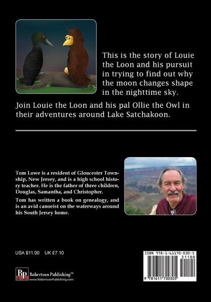 What Happens to the Moon? This is the story of Louie the Loon and his pursuit in trying to find out why the moon changes shape in the nighttime sky. Join Louie the Loon and his pal Ollie the Owl in their adventures around Lake Satchakoon. About the author: Tom Lowe is a resident of Gloucester Township, New Jersey, and is a high school history teacher. He is the father of three children, Douglas, Samantha, and Christopher. Tom has written a book on genealogy, and is an avid canoeist on the waterways around his South Jersey home.
