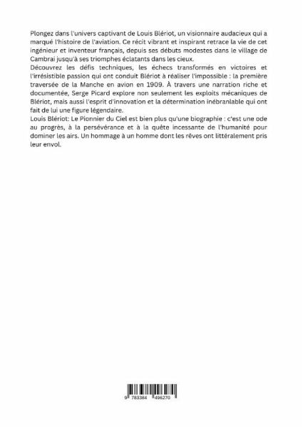 Plongez dans l'univers captivant de Louis Blériot, un visionnaire audacieux qui a marqué l'histoire de l'aviation. Ce récit vibrant et inspirant retrace la vie de cet ingénieur et inventeur français, depuis ses débuts modestes dans le village de Cambrai jusqu'à ses triomphes éclatants dans les cieux.Découvrez les défis techniques, les échecs transformés en victoires et l'irrésistible passion qui ont conduit Blériot à réaliser l'impossible : la première traversée de la Manche en avion en 1909. À travers une narration riche et documentée, Serge Picard explore non seulement les exploits mécaniques de Blériot, mais aussi l'esprit d'innovation et la détermination inébranlable qui ont fait de lui une figure légendaire.Louis Blériot: Le Pionnier du Ciel est bien plus qu'une biographie : c'est une ode au progrès, à la persévérance et à la quête incessante de l'humanité pour dominer les airs. Un hommage à un homme dont les rêves ont littéralement pris leur envol.
