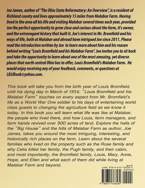 This book will take you from the birth year of Louis Bromfield, until his dying day in March of 1956. "Louis Bromfield and his Malabar Farm" touches on every aspect from Mr. Bromfield's life as a World War One soldier to his days of entertaining world class guests to changing the agriculture field as we know it today. In this book you will learn what life was like at Malabar, the people who lived there, and how Louis, farm managers, and farm hands revived over 900 acres of land. Explore the halls of the "Big House" and the hills of Malabar Farm as author, Joe James, takes you around the most intriguing, interesting, and historically rich places on the farm. Learn about the several families who lived on the property such as the Rose family and why Celia killed her family, the Pugh family, and their cabin, and most importantly, the Bromfield family, Louis, Mary, Anne, Hope, and Ellen and what each of them did while living at Malabar Farm and beyond.