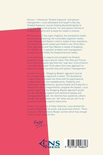 'Graded Exposure' was a course developed by Louis to help physiotherapists to integrate theory into practise. Topics include; the biomedical model; evolutionary reasoning; the vulnerable organism model; fear avoidance model; model of disability and the biopsychosocial model. Section 4 is the 'shopping basket approach' essentially giving therapists a system and method to assess and manage patients well. Louis uses 4 questions, What's wrong? How long? What can I do? and What can you do? These need to be answered with every patient every time. Finally, four sections of Case Histories. Patient stories to help put theory into practise.