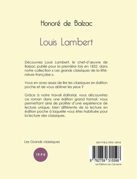 Découvrez Louis Lambert, le chef-d¿¿uvre de Balzac publié pour la première fois en 1832, dans notre collection « Les grands classiques de la littérature française ». Vous en avez assez de lire les classiques en édition poche et de vous abîmer les yeux ? Grâce à notre travail éditorial, vous découvrirez ce roman dans une édition grand format, vous permettant ainsi de profiter d¿une expérience de lecture unique, bien différente de la lecture en édition poche à laquelle vous êtes habituée pour la lecture des classiques.