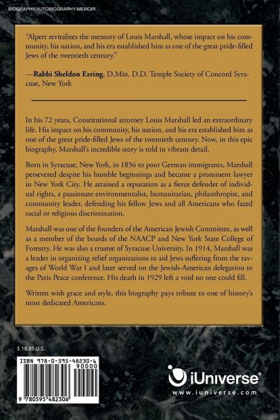 In his 72 years, Constitutional attorney Louis Marshall led an extraordinary life. His impact on his community, his nation, and his era established him as one of the great pride-filled Jews of the twentieth century. Now, in this epic biography, Marshall's incredible story is told in vibrant detail. Born in Syracuse, New York, in 1856 to poor German immigrants, Marshall persevered despite his humble beginnings and became a prominent lawyer in New York City. He attained a reputation as a fierce defender of individual rights, a passionate environmentalist, humanitarian, philanthropist, and community leader, defending his fellow Jews and all Americans who faced racial or religious discrimination. Marshall was one of the founders of the American Jewish Committee, as well as a member of the boards of the NAACP and New York State College of Forestry. He was also a trustee of Syracuse University. In 1914, Marshall was a leader in organizing relief organizations to aid Jews suffering from the ravages of World War I and later served on the Jewish-American delegation to the Paris Peace conference. His death in 1929 left a void no one could fill. Written with grace and style, this biography pays tribute to one of history's most dedicated Americans.