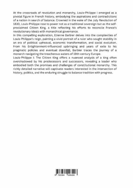 At the crossroads of revolution and monarchy, Louis-Philippe I emerged as a pivotal fig-ure in French history, embodying the aspirations and contradictions of a nation in search of balance. Crowned in the wake of the July Revolution of 1830, Louis-Philippe rose to power not as a traditional sovereign but as the selfproclaimed Citizen King, a title reflecting his efforts to reconcile France's revolutionary ideals with monarchical governance.In this compelling exploration, Etienne Barbier delves into the complexities of Louis-Philippe's reign, painting a vivid portrait of a ruler who sought stability in an era of political upheaval, economic transformation, and social evolution. From his Enlightenment-influenced upbringing and years of exile to his pragmatic policies and eventual downfall, Barbier traces the journey of a monarch navigating the treacherous waters of 19th-century Europe.Louis-Philippe I: The Citizen King offers a nuanced analysis of a king often overshad-owed by his predecessors and successors, revealing a leader who embodied both the promises and challenges of constitutional monarchy. This richly detailed narrative will captivate readers interested in the intersection of history, politics, and the enduring struggle to balance tradition with progress.Perfect for enthusiasts of European history and those curious about the dynamic inter-play of power, revolution, and reform, Barbier's work sheds new light on a fascinating yet often misunderstood chapter of France's past.