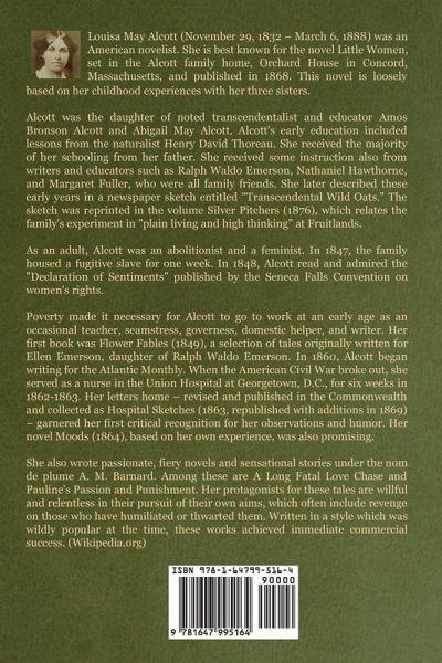 Louisa May Alcott (November 29, 1832 – March 6, 1888) was an American novelist. She is best known for the novel Little Women, set in the Alcott family home, Orchard House in Concord, Massachusetts, and published in 1868. This novel is loosely based on her childhood experiences with her three sisters. Alcott was the daughter of noted transcendentalist and educator Amos Bronson Alcott and Abigail May Alcott. Alcott's early education included lessons from the naturalist Henry David Thoreau. She received the majority of her schooling from her father. She received some instruction also from writers and educators such as Ralph Waldo Emerson, Nathaniel Hawthorne, and Margaret Fuller, who were all family friends. She later described these early years in a newspaper sketch entitled "Transcendental Wild Oats." The sketch was reprinted in the volume Silver Pitchers (1876), which relates the family's experiment in "plain living and high thinking" at Fruitlands. As an adult, Alcott was an abolitionist and a feminist. In 1847, the family housed a fugitive slave for one week. In 1848, Alcott read and admired the "Declaration of Sentiments" published by the Seneca Falls Convention on women's rights. Poverty made it necessary for Alcott to go to work at an early age as an occasional teacher, seamstress, governess, domestic helper, and writer. Her first book was Flower Fables (1849), a selection of tales originally written for Ellen Emerson, daughter of Ralph Waldo Emerson. In 1860, Alcott began writing for the Atlantic Monthly. When the American Civil War broke out, she served as a nurse in the Union Hospital at Georgetown, D.C., for six weeks in 1862-1863. Her letters home – revised and published in the Commonwealth and collected as Hospital Sketches (1863, republished with additions in 1869) – garnered her first critical recognition for her observations and humor. Her novel Moods (1864), based on her own experience, was also promising. She also wrote passionate, fiery novels and sensational stories under the nom de plume A. M. Barnard. Among these are A Long Fatal Love Chase and Pauline's Passion and Punishment. Her protagonists for these tales are willful and relentless in their pursuit of their own aims, which often include revenge on those who have humiliated or thwarted them. Written in a style which was wildly popular at the time, these works achieved immediate commercial success. (Wikipedia.org)