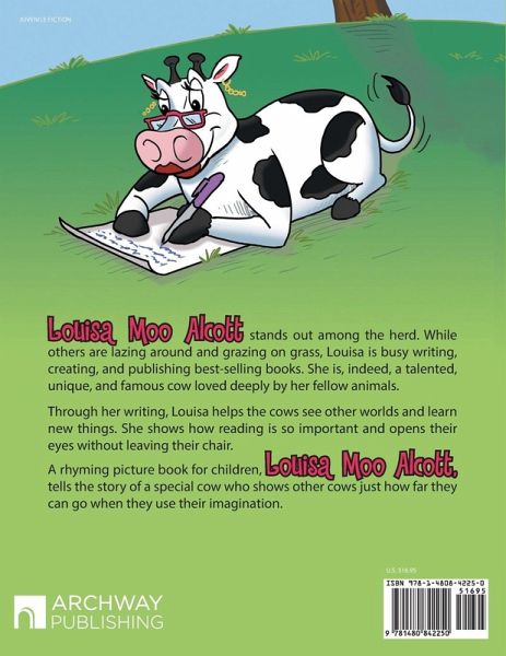 Louisa Moo Alcott stands out among the herd. While others are lazing around and grazing on grass, Louisa is busy writing, creating, and publishing best-selling books. She is, indeed, a talented, unique, and famous cow loved deeply by her fellow animals. Through her writing, Louisa helps the cows see other worlds and learn new things. She shows how reading is so important and opens their eyes without leaving their chair. A rhyming picture book for children, Louisa Moo Alcott, tells the story of a special cow who shows other cows just how far they can go when they use their imagination.