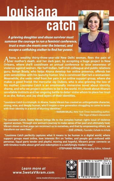 A grieving daughter and abuse survivor must summon the courage to run a feminist conference, trust a man she meets over the Internet, and escape a catfishing stalker to find her power. Ahana, a wealthy thirty-three-year-old New Delhi woman, flees the pain of her mother's death, and her dark past, by accepting a huge project in New Orleans, where she'll coordinate an annual conference to raise awareness of violence against women. Her half-Indian, half-Irish colleague and public relations guru, Rohan Brady, who helps Ahana develop her online presence, offends her prim sensibilities with his raunchy humor. She is convinced that he's a womanizer. Meanwhile, she seeks relief from her pain in an online support group, where she makes a good friend: the mercurial Jay Dubois, who is also grieving the loss of his mother. Louisiana Catch is an emotionally immersive novel about identity, shame, and who we project ourselves to be in the world. It's a book about Ahana's unreliable instincts and her ongoing battle to deter¬mine whom to place her trust in as she, Rohan, and Jay shed layers of their identities. "Louisiana Catch is a triumph. In Ahana, Sweta Vikram has created an unforgettable character, strong, wise, and deeply human, who'll inspire a new generation struggling to come to terms with their identity in a world of blurring identities." --KARAN BAJAJ, New York Times bestselling author, The Yoga of Max's Discontent "In Louisiana Catch, Sweta Vikram brings life to the complex human rights issue of violence against women. Through one woman's journey to make sense of her past and ultimately heal, Vikram shows us that yoga can reconnect us to ourselves, and that by empowering others, we transform our own lives." --ZOË LEPAGE, Founder, Exhale to Inhale "Louisiana Catch perfectly captures what it means to be human in a digital world, where support groups meet online, love interests flirt on Twitter, and people get confused with personas. Equal parts tender and playful, moving and hopeful, Vikram's prose connects us with timeless truths about grief and redemption in a satisfyingly modern way." --STEPHANIE PATERIK, Managing Editor, Adweek Learn more at www.SwetaVikram.com From Modern History Press, www.ModernHistoryPress.com