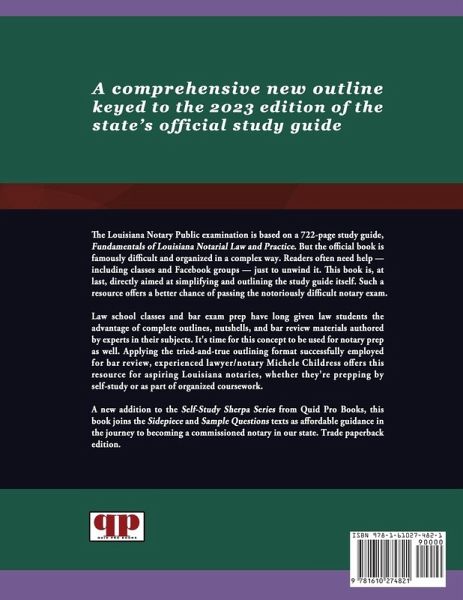 NEW EDITION FOR 2023 -Updates and expands the previous edition, and is keyed to the current state study guide. The Louisiana Notary Public exam is based on a 722-page study guide, Fundamentals of Louisiana Notarial Law and Practice. But the official book is famously difficult and organized in a complex way. Readers often need help - including classes and Facebook groups - just to unwind it. This book is, at last, directly aimed at simplifying and outlining the study guide itself. Such a resource offers a better chance of passing the notoriously challenging notary exam. Law school classes and bar exam prep have long given law students the advantage of complete outlines, nutshells, and bar review materials authored by experts in their subjects. It's time for this concept to be used for notary prep as well. Applying the tried-and-true outlining format successfully employed for bar review, experienced lawyer/notary Michele Childress offers this resource for aspiring Louisiana notaries - whether they're prepping by self-study or as part of organized coursework. A new addition to the best-selling Self-Study Sherpa Series from Quid Pro Books - NOW IN A NEW, SECOND trade paperback edition. This Outline joins the Sidepiece and Sample Questions books as affordable guidance in the journey to becoming a commissioned notary in our state. ABOUT THE AUTHOR: Michele Childress graduated from Loyola Law School-New Orleans after earning her undergraduate degree from Loyola as well. She joined the Louisiana bar in 2002 and received her notarial commission that same year. Along with her husband Alan, she has owned a notary/shipping service in Jefferson Parish, and they have performed thousands of notarial acts of various kinds. They also teach notary prep seminars via Zoom. Michele previously edited new editions of classic books on constitutional law, law study, and U.S. civics.
