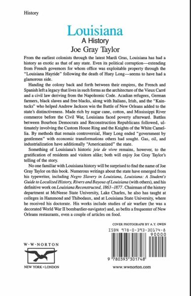 Handing the colony of Louisiana back and forth between their empires, the French and Spanish left a legacy that lives in such forms as the architecture of the Vieux Carre and a civil law deriving from the Napoleonic Code. Acadian refugees, German farmers, black slaves and free blacks, along with Italians, Irish, and the "Kaintucks" who helped Andrew Jackson win the Battle of New Orleans added to the state's distinctiveness. Made rich by sugar cane, cotton, and Mississippi River commerce before the Civil War, Louisiana faced poverty afterward. Battles between Bourbon Democrats and Reconstruction Republicans followed, ultimately involving the Custom House Ring and the Knights of the White Camelia. By methods that remain controversial, Huey Long ended "government by gentlemen" with economic transformations other had sought. Gas, oil, and industrialization have additionally "Americanized" the state. Something of Louisiana's historic joie de vivre remains, however, to the gratification of residents and visitors alike; both will enjoy Joe Gray Taylor's telling of the story.