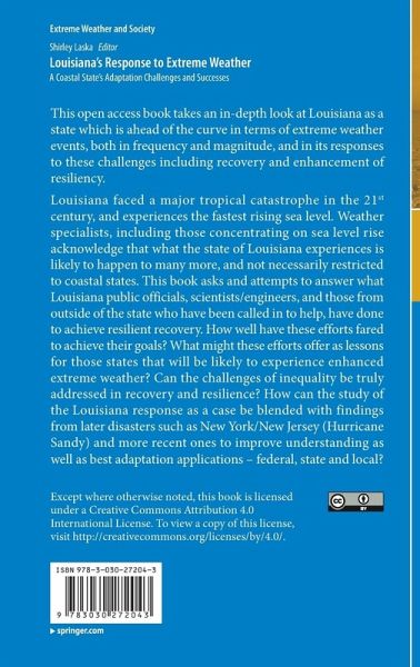 This book is open access under a CC BY 4.0 license. This book takes an in-depth look at Louisiana as a state which is ahead of the curve in terms of extreme weather events, both in frequency and magnitude, and in its responses to these challenges including recovery and enhancement of resiliency. Louisiana faced a major tropical catastrophe in the 21st century, and experiences the fastest rising sea level. Weather specialists, including those concentrating on sea level rise acknowledge that what the state of Louisiana experiences is likely to happen to many more, and not necessarily restricted…mehr