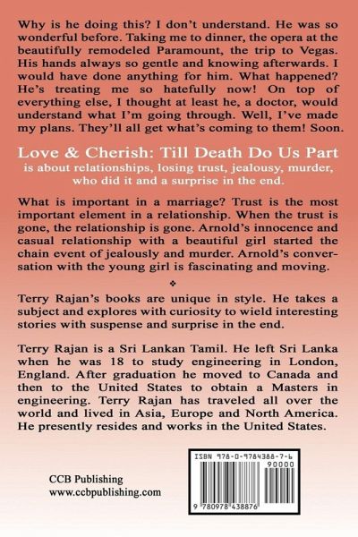 Why is he doing this? I don't understand. He was so wonderful before. Taking me to dinner, the opera at the beautifully remodeled Paramount, the trip to Vegas. His hands always so gentle and knowing afterwards. I would have done anything for him. What happened? He's treating me so hatefully now! On top of everything else, I thought at least he, a doctor, would understand what I'm going through. Well, I've made my plans. They'll all get what's coming to them! Soon. Love & Cherish: Till Death Do Us Part is about relationships, losing trust, jealousy, murder, who did it and a surprise in the end. What is important in a marriage? Trust is the most important element in a relationship. When the trust is gone, the relationship is gone. Arnold's innocence and casual relationship with a beautiful girl started the chain event of jealously and murder. Arnold's conversation with the young girl is fascinating and moving. About the Author: Terry Rajan's books are unique in style. He takes a subject and explores with curiosity to wield interesting stories with suspense and surprise in the end. Terry Rajan is a Sri Lankan Tamil. He left Sri Lanka when he was 18 to study engineering in London, England. After graduation he moved to Canada and then to the United States to obtain a Masters in engineering. Terry Rajan has traveled all over the world and lived in Asia, Europe and North America. He presently resides and works in the United States.