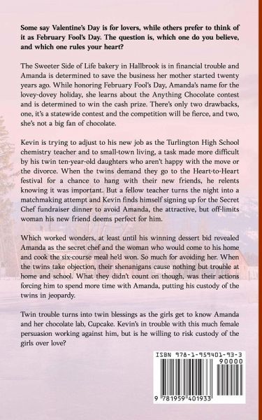 Some say Valentine's Day is for lovers, while others prefer to think of it as February Fool's Day. The question is, which one do you believe, and which one rules your heart? The Sweeter Side of Life bakery in Hallbrook is in financial trouble and Amanda is determined to save the business her mother started twenty years ago. While honoring February Fool's Day, Amanda's name for the lovey-dovey holiday, she learns about the Anything Chocolate contest and is determined to win the cash prize. There's only two drawbacks, one, it's a statewide contest and the competition will be fierce, and two, she's not a big fan of chocolate. Kevin is trying to adjust to his new job as the Turlington High School chemistry teacher and to small-town living, a task made more difficult by his twin ten-year-old daughters who aren't happy with the move or the divorce. When the twins demand they go to the Heart-to-Heart festival for a chance to hang with their new friends, he relents knowing it was important. But a fellow teacher turns the night into a matchmaking attempt and Kevin finds himself signing up for the Secret Chef fundraiser dinner to avoid Amanda, the attractive, but off-limits woman his new friend deems perfect for him. Which worked wonders, at least until his winning dessert bid revealed Amanda as the secret chef and the woman who would come to his home and cook the six-course meal he'd won. So much for avoiding her. When the twins take objection, their shenanigans cause nothing but trouble at home and school. What they didn't count on though, was their actions forcing him to spend more time with Amanda, putting his custody of the twins in jeopardy. Twin trouble turns into twin blessings as the girls get to know Amanda and her chocolate lab, Cupcake. Kevin's in trouble with this much female persuasion working against him, but is he willing to risk custody of the girls over love?