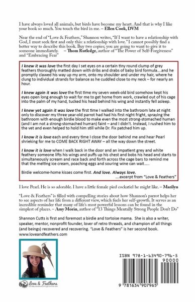 When people and pets choose to share life together, great personal transformation becomes possible. In Love & Feathers, Shannon (a person) and Pearl (a parrot) learn from each other how to love and be loved, enjoy life to the fullest, face challenges with humor and courage, and see the best in themselves, each other, and all beings.
