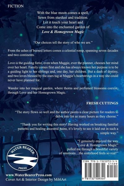 With the blue moon comes a spell Sewn from stardust and tradition. Let it touch your heart and Come into the enchanted garden of Love & Homegrown Magic. "Our choices tell the story of who we are." From the ashes of burned letters comes a celestial romp, spanning seven decades and two continents. Love is the guiding force, even when Maggie, ever the planner, chooses her mind over her heart. Family comes first and she has always known her purpose is to be a guiding light to her siblings and, one day, her children. But a dash of destiny, and two loves blessed by the stars tug at Maggie's heartstrings in a way she could never have planned for. Wander into her magical garden, where thorns and perfumed blossoms coexist, through Love and her Homegrown Magic.
