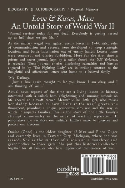 Love & Kisses, Max is a compilation of love letters, a forbidden journal, a secret code, photos, radio news reports, a P.O.W.'s thank you, and war-time memorabilia of seventy years ago. The journal and letters were written by Max Elwood Guger who served aboard the aircraft carrier, USS Yorktown (The Fighting Lady) in 1944 and 1945. Love & Kisses, Max reads like an illustrated novel. It begins with Max's induction into the Navy in 1944 and his experience in boot camp during wartime. Assigned to the Yorktown, Max daily journals the ship's position, battle engagements, casualties and victories. He describes the end of the war, the surrender of Japan, and the rescue of P.O.W.'s. He has the opportunity to survey the destruction in Yokohama, and writes a vivid depiction in a letter. The news reports, published by the ship from radio reports, convey the gravity of a world at war. This is NOT a war story, however. This is a portrayal of a man's love and angst expressed in letters. Defined by censorship regulations, their cool demeanor show how he protected his family from worry while engaged in war. They are the heart of this story. This is life as we lived it during World War II. It is the reality of an ordinary family coping in the midst of crises. Add in the photographs and childhood memories, and it becomes a rare glimpse into history from a unique perspective.