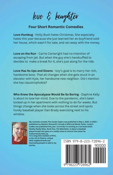 Love Humbug-Holly Bush hates Christmas. She especially hates this year because she just learned her ex-boyfriend sold her house, which wasn't for sale, and ran away with the money. Love on the Run-Carrie Cartwright had no intention of escaping from jail. But when the guy she's handcuffed to decides to make a break for it, she's just along for the ride. Love Has Its Ups and Downs-Izzy's goal is to marry her rich, handsome boss. That all changes when she gets stuck in an elevator with Kyle, her handsome new neighbor. Did I mention she has claustrophobia? Who Knew the Apocalypse Would Be So Boring-Daphne Kelly is about to lose her mind. Due to the pandemic, she's been locked up in her apartment with nothing to do for weeks. But things change when she looks across the street and spots hunky baseball player Dan Brady exercising next to his window.