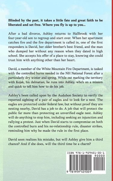 Blinded by the past, it takes a little fate and great faith to be liberated and set free. Where you fly is up to you... After a bad divorce, Ashley returns to Hallbrook with her four-year-old son to regroup and start over. When her apartment catches fire and the fire department is called in, one of the first responders is David, her older brother's best friend, and the man who dumped her without any reason when they dated in high school. She accepts his offer of a place to stay, knowing she could trust him with anything other than her heart. David, a member of the White Mountain Fire Department, is tasked with the controlled burns needed in the NH National Forest after a particularly dry winter and spring. While out marking the territory with Kojak, his dalmatian, he runs into Ashley, who's on a mission and quick to tell him how to do his job. Ashley's been called upon by the Audubon Society to verify the reported sighting of a pair of eagles and to look for a nest. The eagles are protected under federal law, but without proof they are nesting nearby, David has a job to do. A job that will protect the public far more than protecting an unverified eagle nest. Ashley will do anything to stop him, including seeking an injunction and rallying a protest. Just when David starts to compromise on both the controlled burn and his no-relationship rule, disaster strikes, reminding him why he made the rule in the first place. David soon realizes his mistake, but will Ashley give him a third chance? And if she does, will the third time be a charm?