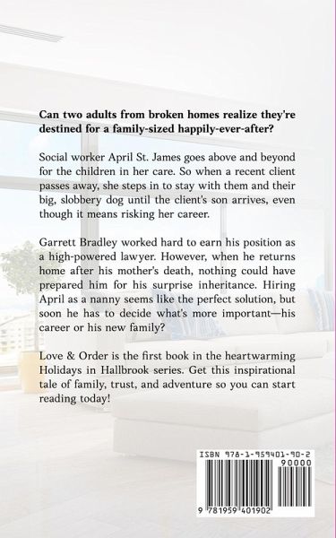 Can two adults from broken homes realize they're destined for a family-sized happily-ever-after? Social worker April St. James goes above and beyond for the children in her care. So when a recent client passes away, she steps in to stay with them and their big, slobbery dog until the client's son arrives, even though it means risking her career. Garrett Bradley worked hard to earn his position as a high-powered lawyer. However, when he returns home after his mother's death, nothing could have prepared him for his surprise inheritance. Hiring April as a nanny seems like the perfect solution, but soon he has to decide what's more important-his career or his new family? Love & Order is the first book in the heartwarming Holidays in Hallbrook series. Get this inspirational tale of family, trust, and adventure so you can start reading today!