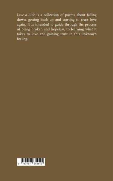 Love a little is a collection of poems about falling down, getting back up and starting to trust love again. It is intended to guide through the process of being broken and hopeless, to learning what it takes to love and gaining trust in this unknown feeling.