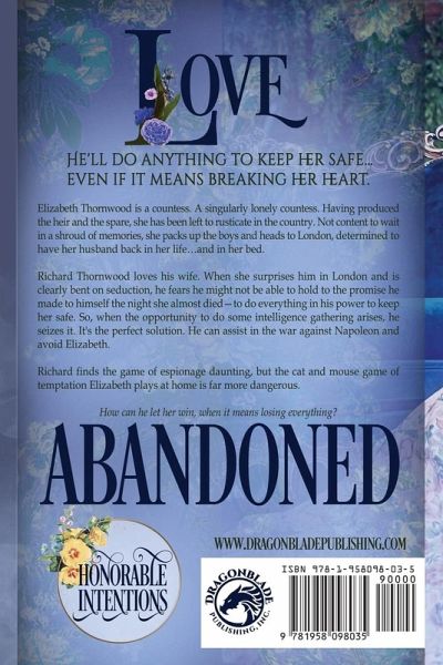 He'll do anything to keep her safe...even if it means breaking her heart. Elizabeth Thornwood is a countess. A singularly lonely countess. Having produced the heir and the spare, she has been left to rusticate in the country. Not content to wait in a shroud of memories, she packs up the boys and heads to London, determined to have her husband back in her life...and in her bed. Richard Thornwood loves his wife. When she surprises him in London and is clearly bent on seduction, he fears he might not be able to hold to the promise he made to himself the night she almost died-to do everything in his power to keep her safe. So, when the opportunity to do some intelligence gathering arises, he seizes it. It's the perfect solution. He can assist in the war against Napoleon and avoid Elizabeth. Richard finds the game of espionage daunting, but the cat and mouse game of temptation Elizabeth plays at home is far more dangerous. How can he let her win, when it means losing everything? Honorable Intentions Love Denied Love Abandoned Love Unraveled