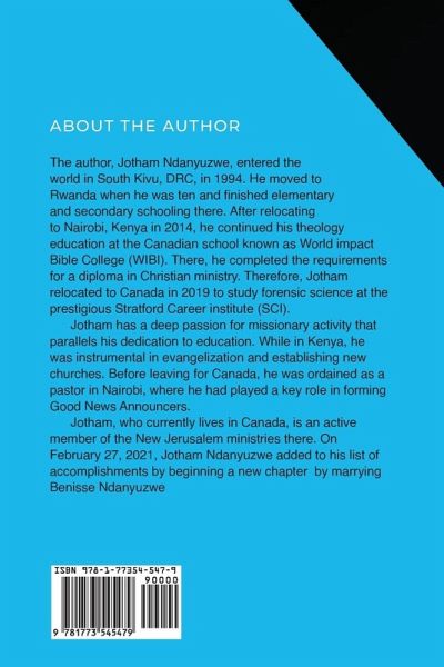 Author Jotham Ndanyuzwe, entered the world in South Kivu, DRC, in 1994. He moved to Rwanda when he was ten and finished elementary and secondary schooling there. After relocating to Nairobi, Kenya in 2014, he continued his theology education at the Canadian school known as World Impact Bible Institute (WIBI). There, he completed the requirements for a diploma in Christian ministry. Thereafter, Jotham relocated to Canada in 2019 to study forensic science at the prestigious Stratford Career Institute (SCI).Jotham has a deep passion for missionary activity that parallels his dedication to education. While in Kenya, he was instrumental in evangelization and establishing new churches. Before leaving for Canada, he was ordained as a pastor in Nairobi, where he had played a key role in forming Good News Announcers.Jotham, who currently lives in Canada, is an active member of the New Jerusalem Ministries there. On February 27, 2021, Jotham Ndanyuzwe added marriage to his list of accomplishments; he married his soulmate, Benisse Ndanyuzwe.