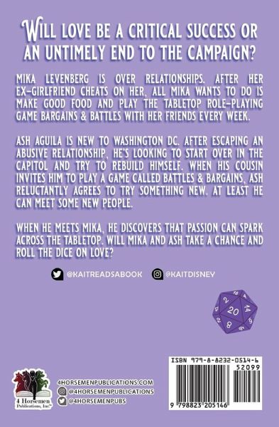 Will love be a critical success or an untimely end to the campaign? Mika Levenberg is over relationships. After her ex-girlfriend cheats on her, all Mika wants to do is make good food and play the tabletop role-playing game Bargains & Battles with her friends every week. Ash Aguila is new to Washington DC. After escaping an abusive relationship, he's looking to start over in the Capitol and try to rebuild himself. When his cousin invites him to play a game called Battles & Bargains, Ash reluctantly agrees to try something new. At least he can meet some new people. When he meets Mika, he discovers that passion can spark across the tabletop. Will Mika and Ash take a chance and roll the dice on love?